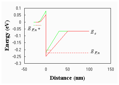 Current transport across a n+-n heterojunction is similar to that of a metal-semiconductor junction: Diffusion, thermionic emission as well as tunneling of carriers across the barrier can occur. However to identify the current components one must first identify the potentials fn+ and fn by solving the electrostatic problem. From the band diagram one finds that a barrier exists for electrons going from the n+ to the n-doped region as well as for electrons going in the opposite direction. |