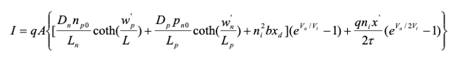 The general expression for the ideal diode current is obtained by applying the boundary conditions to the general solution of the diffusion equation for each of the quasi-neutral regions, as described by equation (2.9.13) and (2.9.14): |