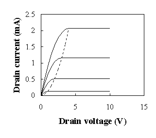 | Figure 7.2.2 : | I-V characteristics of an n-type MOSFET with VG = 5 V (top curve), 4 V, 3 V and 2 V (bottom curve) |