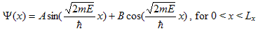 where the coefficients A and B must be determined by applying the boundary conditions. Since the potential is infinite on both sides of the well, the probability of finding an electron outside the well and at the well boundary equals zero. Therefore, the wave function must be zero on both sides of the infinite quantum well or: |
