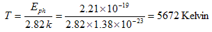 The peak value of the blackbody radiation per unit frequency occurs at 2.82 kT and increases with the third power of the temperature. Radiation from the sun closely fits that of a black body at 5800 K. |