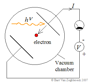 The experimental apparatus consists of two metal electrodes within a vacuum chamber. Light is incident on one of two electrodes to which an external voltage is applied. The external voltage is adjusted so that the current due to the photo-emitted electrons becomes zero. This voltage corresponds to the maximum kinetic energy, K.E., of the electrons in units of electron volt. That voltage is measured for different wavelengths and is plotted versus the inverse of the wavelength as shown in Figure 1.2.2. The resulting curve is a straight line. |