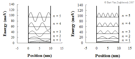 The wavefunctions corresponding to each energy level are shown in Figure 1.2.7 (a). Each wavefunction has been shifted by the corresponding energy and scaled with an arbitrary magnitude as is commonly done. The probability density function, P(x)=Ψ(x)*Ψ(x), provides the probability of finding an electron at a certain location in the well. These (unnormalized) probability density functions are shown in Figure 1.2.7 (b) for the first five energy levels. For instance, for n = 2 the electron is least likely to be in the middle of the well and at the edges of the well. The electron is most likely to be one quarter of the well width away from either edge. |
