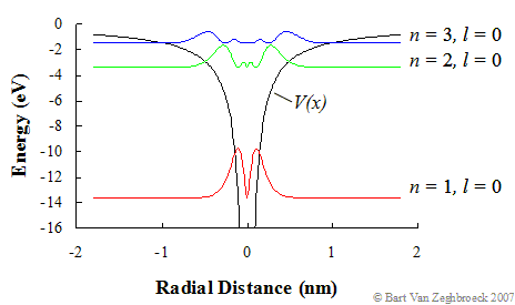 Where n is the principal quantum number. This potential as well as the first three probability density functions (r2|Ψ|2) of the radially symmetric wavefunctions (l = 0) is shown in Figure 1.2.8. Note that equation (1.2.34) is the same as equation (1.2.10) The potential energy, V(r), and first three probability densities, r2|Ψ|2 of the radially symmetric wavefunctions, corresponding to l = 0, are shown in Figure 1.2.8. |