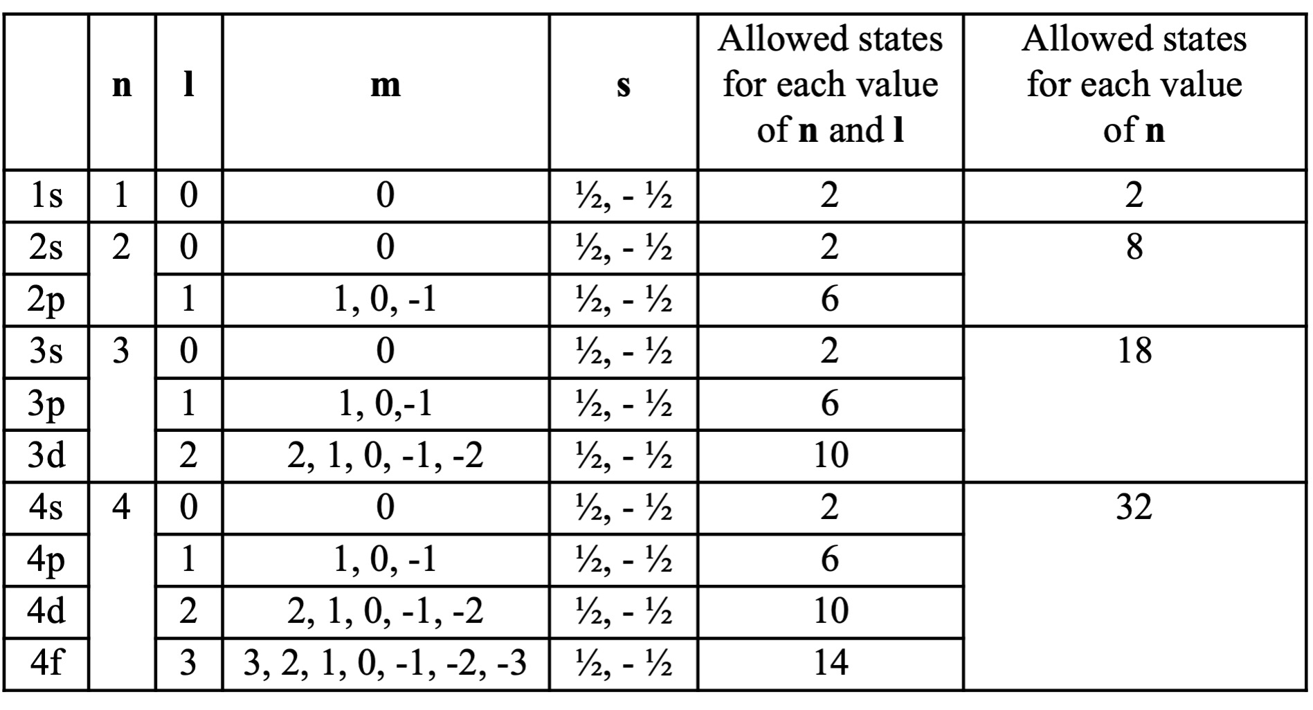 Once the energy levels of an atom are known, one can find the electron configurations of the atom, provided the number of electrons occupying each energy level is known. Electrons are Fermions since they have a half integer spin. They must therefore obey the Pauli exclusion principle. This exclusion principle states that no two Fermions can occupy the same energy level corresponding to a unique set of quantum numbers n, l, m or s. The ground state of an atom is therefore obtained by filling each energy level, starting with the lowest energy, up to the maximum number as allowed by the Pauli exclusion principle. |