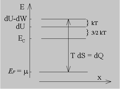 | Figure 2.11.1 : | Energy, work and heat per electron in an ideal electron gas visualized on an energy band diagram. |