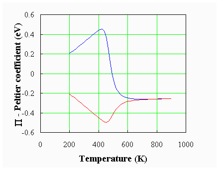 The resulting Peltier coefficient as a function of temperature for silicon is shown in the figure below: |