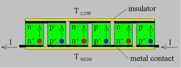 | Figure 2.11.3: | Cross-section of a thermo-electric cooler showing the alternating n-type and p-type sections described in the text. |