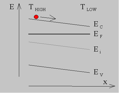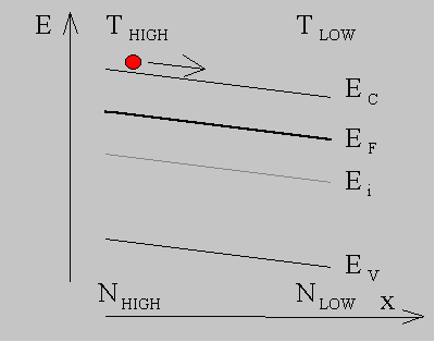 At constant temperature and in thermal equilibrium there is no current as the diffusion current is balanced by the drift current associated with the built-in electric field caused by the graded doping density. As a current is applied to the semiconductor the built-in field is reduced so that the carriers diffuse from the high to low doping density. This causes a temperature reduction on the low-doped side, which continues until the entropy is constant throughout the semiconductor. Since the entropy per electron equals the distance between the conduction band edge and the Fermi energy plus 5/2 kT one finds that the conduction band edge is almost parallel to the Fermi energy. |