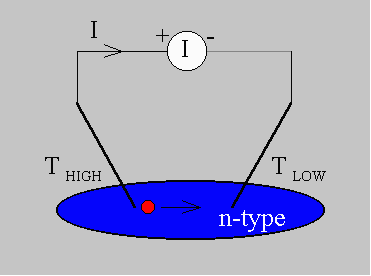 A simple explanation for this experiment is that the carriers move within the semiconductor from the hot probe to the cold probe. While diffusion seems to be a plausible mechanism to cause the carrier flow it is actually not the most important mechanism since the material is uniformly doped. However, as will be discussed below there is a substantial electric field in the semiconductor so that the drift current dominates the total current. |