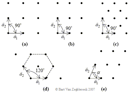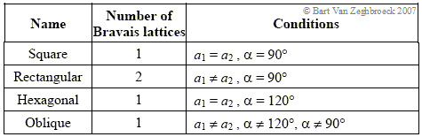 The five Bravais lattices are mathematically described in Table 2.2.1. a1 and a2 are the magnitudes of the unit vectors and a is the angle between them. |