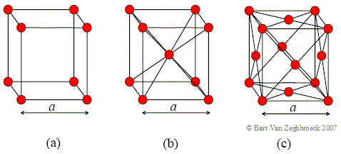 | Figure 2.2.3.: | a) The simple cubic (SC), b) the body-centered cubic (BCC), and c) the face centered cubic (FCC) lattice. |