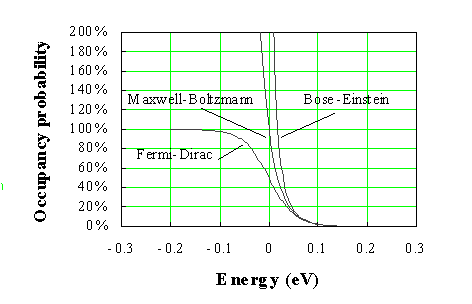 | Figure 2.5.4 : | Probability of occupancy versus energy of the Fermi-Dirac, the Bose-Einstein and the Maxwell-Boltzmann distribution. The Fermi energy, EF, is assumed to be zero. ![]() |