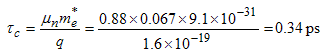 | Example 2.8 | Electrons in undoped gallium arsenide have a mobility of 8,800 cm2/V-s. Calculate the average time between collisions. Calculate the distance traveled between two collisions (also called the mean free path). Use an average velocity of 107 cm/s. |