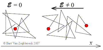 It should be noted that carriers do not follow a straight path along the electric field lines. Instead they bounce around in the semiconductor and constantly change direction and velocity due to scattering. This behavior occurs even when no electric field is applied and is due to the thermal energy of the carriers. Thermodynamics teaches us that electrons in a non-degenerate and non-relativistic electron gas have a thermal energy of kT/2 per particle per degree of freedom. A typical thermal velocity at room temperature is around 107 cm/s, which exceeds the typical drift velocity in semiconductors. The carrier motion in the semiconductor in the absence and in the presence of an electric field can therefore be visualized as in Figure 2.7.2. |