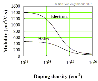 | Figure 2.7.3 : | Electron and hole mobility versus doping density for silicon. ![]() |