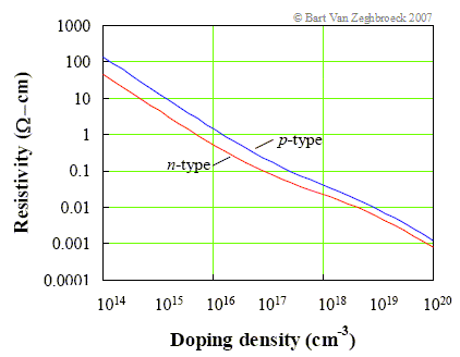| Figure 2.7.4: | Resistivity of n-type and p-type silicon versus doping density. ![]() |