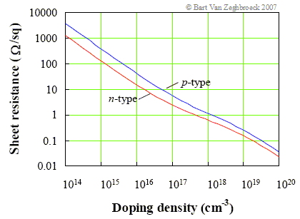 | Figure 2.7.5: | Sheet resistance of a 14 mil thick n-type and p-type silicon wafer versus doping density. ![]() |