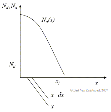 The doping profile is representative of a diffused and/or ion-implanted p-type layer in a uniformly doped n-type substrate. The metallurgical junction depth, xj, occurs when the two doping densities are equal. The sheet resistance of the section with width, dx, is given by: |