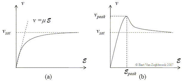 | Figure 2.7.7: | Velocity-field relation for a) materials without accessible higher bands such as silicon and b) materials with an accessible higher band such as GaAs. |