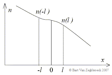 Shown is a variable carrier density, n(x). Of interest are the carrier densities which are one mean free path away from x = 0, since the carriers, which will arrive at x = 0 originate either at x = -l or x = l. The flux at x = 0 due to carriers that originate at x = -l and move from left to right equals: |