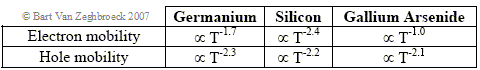 | Table 2.7.1 : | Temperature dependence of the mobility in germanium, silicon and gallium arsenide due to phonon scattering |
