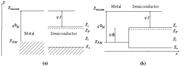 The barrier between the metal and the semiconductor can be identified on an energy band diagram. To construct such diagram we first consider the energy band diagram of the metal and the semiconductor, and align them using the same vacuum level as shown in Figure 3.2.2 (a). As the metal and semiconductor are brought together, the Fermi energies of the metal and the semiconductor do not change right away. This yields the flatband diagram of Figure 3.2.2 (b). |
