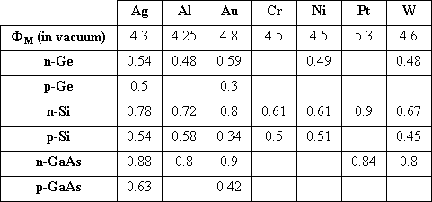 The measured barrier height for selected metal-semiconductor junctions is listed in Table 3.2.1. These experimental barrier heights often differ from the ones calculated using (3.2.1) or (3.2.2). This is due to the detailed behavior of the metal-semiconductor interface. The ideal metal-semiconductor theory assumes that both materials are infinitely pure, that there is no interaction between the two materials and no unwanted interfacial layer. Chemical reactions between the metal and the semiconductor alter the barrier height as do interface states at the surface of the semiconductor and interfacial layers. Some general trends however can still be observed. As predicted by (3.2.1),the barrier height on n-type semiconductors increases for metals with a higher work function as can be verified for silicon. Gallium arsenide on the other hand is known to have a large density of surface states so that the barrier height becomes virtually independent of the metal. Furthermore, one finds that the barrier heights reported in the literature to vary widely due to different surface cleaning procedures. |