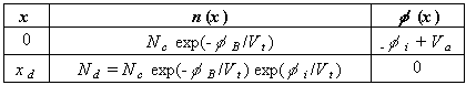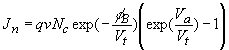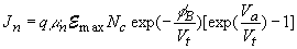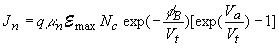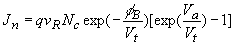 This expression states that the current is the product of the electronic charge, q, a velocity, v, and the density of available carriers in the semiconductor located next to the interface. The velocity equals the mobility multiplied with the field at the interface for the diffusion current and the Richardson velocity (see section 3.4.2) for the thermionic emission current. The minus one term ensures that the current is zero if no voltage is applied as in thermal equilibrium any motion of carriers is balanced by a motion of carriers in the opposite direction. |