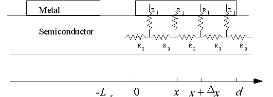 The contact between a metal and a thin semiconductor layer can be described with the resistive network shown in Figure 3.5.1. This equivalent circuit is obtained by slicing the structure into small sections with length Δx, so that the contact resistance, R1, and the semiconductor resistance, R2, are given by: |
