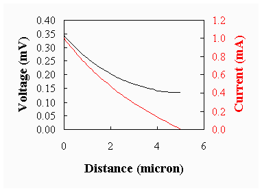 | Figure 3.5.2: | Lateral current and voltage underneath a 5 µn;m long and 1 mm wide metal contact with a contact resistivity of 10-5 Ω-cm2 on a thin semiconductor layer with a sheet resistance of 100 Ω/o. |