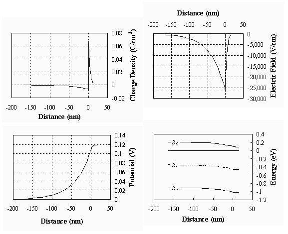 The solutions for the charge density, electric field, potential and energy band diagram are plotted in the Figure 3.8.1: |