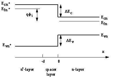 Current transport across a n+-n heterojunction is similar to that of a metal-semiconductor junction: Diffusion, thermionic emission as well as tunneling of carriers across the barrier can occur. However to identify the current components one must first identify the potentials fn+ and fn by solving the electrostatic problem. From the band diagram one finds that a barrier exists for electrons going from the n+ to the n-doped region as well as for electrons going in the opposite direction. |