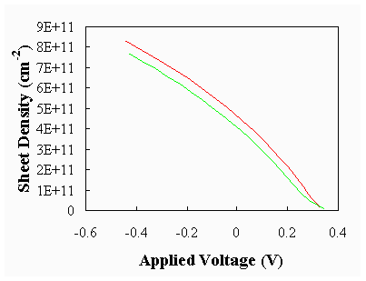 From the figures one finds that the analysis without quantization predicts a larger barrier to the left of the interface and a larger sheet charge for a given voltage. The actual solution is expected to be somewhere in between the two presented here, especially for the case where more than one quantized level exists and is occupied. |