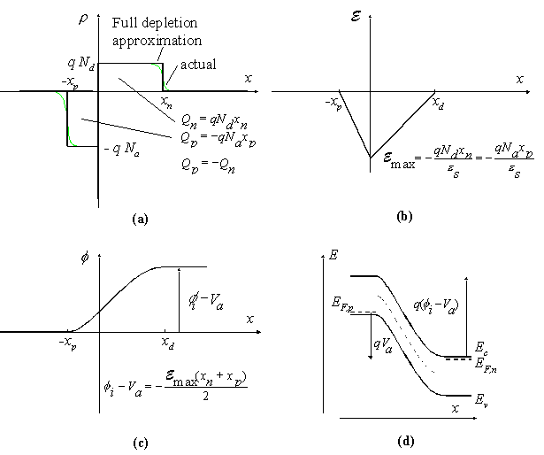 Once the full-depletion approximation is made, it is easy to find the charge density profile: It equals the sum of the charges due to the holes, electrons, ionized acceptors and ionized holes: |