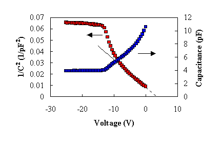 The built-in voltage is obtained at the intersection of the 1/C2 curve and the horizontal axis, while the doping density is obtained from the slope of the curve. |