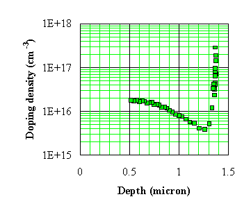 The doping profile calculated from the date presented in Figure 4.3.3 is shown in Figure 4.3.4. The figure confirms the presence of the highly doped substrate and yields the thickness of the n-type layer. No information is obtained at the interface (x = 0) as is typical for doping profiles obtained from C-V measurements. This is because the capacitance measurement is limited to small forward bias voltages since the forward bias current and the diffusion capacitance affect the accuracy of the capacitance measurement. |
