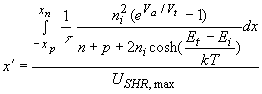 From which an effective width can be defined which, when multiplied with the maximum recombination rate, equals the integral of the recombination rate over the depletion region. This effective width, x', is then defined by: |