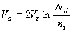 Using equations (4.4.1) and (4.4.2), one finds that high injection occurs in a p+-n diode for the following applied voltage: |