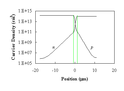 As an example we now consider a silicon p-n diode with Na = 1.5 x 1014 cm-3 and Nd = 1014 cm-3. The minority carrier lifetime was chosen to be very short, namely 400 ps, so that most features of interest can easily be observed. We start by examining the electron and hole density throughout the p-n diode, shown in Figure 4.4.1: |