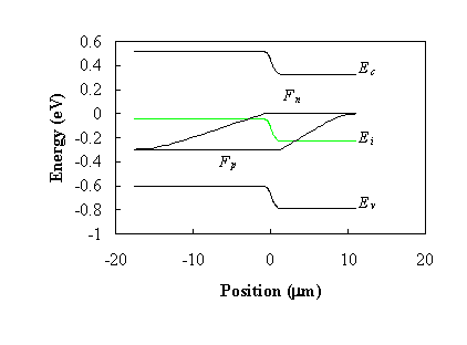 The majority carrier densities in the quasi-neutral region simply equal the doping density. The minority carrier densities in the quasi-neutral regions are obtained from equations (4.4.16) and (4.4.17). The electron and hole densities in the depletion region are calculating using the assumption that the electron/hole quasi-Fermi energy in the depletion region equals the electron/hole quasi-Fermi energy in the quasi-neutral n-type/p-type region. The corresponding band diagram is shown in Figure 4.4.2: |