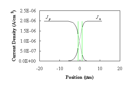 Next, we discuss the current density. Shown in Figure 4.4.3 is the electron and hole current density as calculated using (4.4.18) and (4.4.19). The current due to recombination in the depletion region was assumed to be constant. |