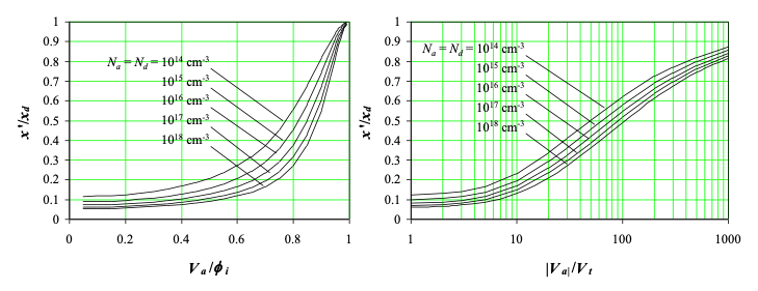 | Figure 4.4.6: | Normalized effective width, x'/xd, under a) forward bias and b) reverse bias, of a symmetric abrupt silicon p-n junction |
