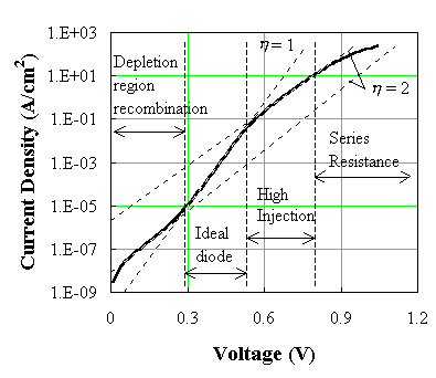 where the slope is in units of V/decade. To the left of the ideal diode region there is the region where the current is dominated by the trap-assisted recombination in the depletion region described in section 4.4.3.2. This part of the curve has an ideality factor of two. To the right of the ideal diode region, the current becomes limited by high injection effects and by the series resistance. |