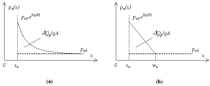 | Figure 4.4.8: | Minority carrier distribution in (a) a "long" diode, and (b) a "short" diode. The excess minority-carrier charge, ΔQp, in the quasi-neutral region, is proportional to the area defined by the solid and dotted lines. |
