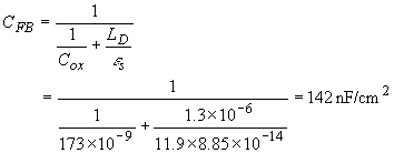 The flatband capacitance of the MOS structure at flatband is obtained by calculating the series connection of the oxide capacitance and the capacitance of the semiconductor, yielding: |