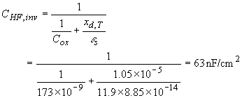 In inversion, the capacitance becomes independent of the gate voltage. The low frequency capacitance equals the oxide capacitance since charge is added to and removed from the inversion layer. The high frequency capacitance is obtained from the series connection of the oxide capacitance and the capacitance of the depletion layer having its maximum width, xd,T. The capacitances are given by: |