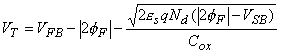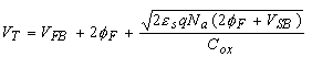 The threshold voltage equals the sum of the flatband voltage, twice the bulk potential and the voltage across the oxide due to the depletion layer charge, or: |