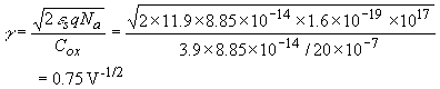 | Example 7.3 | Calculate the threshold voltage of a silicon nMOSFET when applying a substrate voltage, VBS = 0, -2.5, -5, -7.5 and -10 V. The capacitor has a substrate doping Na = 1017 cm-3, a 20 nm thick oxide (εox = 3.9 ε0) and an aluminum gate (ΦM = 4.1 V). Assume there is no fixed charge in the oxide or at the oxide-silicon interface. |