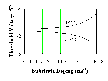 The threshold voltage dependence on the doping density is illustrated with Figure 7.4.1 for both n-type and p-type MOSFETs with an aluminum gate metal. |